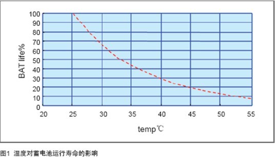 失水的途径比较多:节流阀设计不合理,频繁开启;电源对蓄电池频繁均充;环境温度过高。其中高温是最主要的因素,高温会加速蓄电池失水速度,导致蓄电池容量下降。以25℃为基准,当蓄电池运行环境上升10℃,寿命减少50%,如图1所示。